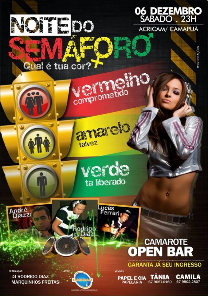 Os ingressos para a pista e camarotes open bar da Noite do Semáforo podem ser adquiridos na Papelaria Papel e Cia, ou com as promoters Tânia (9957-0160 e Camila (9802-2807). O evento é realizado por Rodrigo Diaz e Marquinhos Freitas.