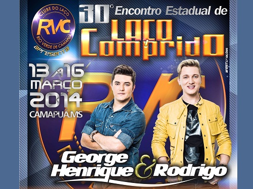 O principal show da festa acontecerá no sábado (15), com a animação da dupla, George Henrique e Rodrigo, os afilhados de Bruno e Marrone chegarão a Camapuã em sua melhor fase da carreira após o lançamento do single Nunca Mais, que está entre as músicas mais tocadas do Brasil.