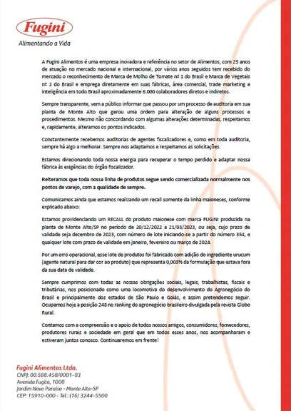 Em posicionamento divulgado nesta quinta-feira (30), a Fugini admitiu o uso de corante vencido em maioneses, mas diz que percentual era pequeno. "Esse lote de produtos foi fabricado com adição do ingrediente urucum (agente natural para dar cor ao produto) que representa 0,003% da formulação que estava fora da sua data de validade", declarou a empresa.