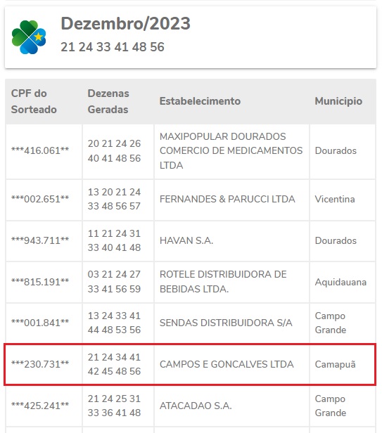 O sorteio foi realizado no dia 31 de dezembro de 2023 e teve as seguintes dezenas sorteadas: 21 – 24 – 33 – 41 – 48 – 56. A apuração foi referente as compras realizadas pelos consumidores no mês de novembro. O próximo sorteio será no dia 30 de janeiro de 2024.