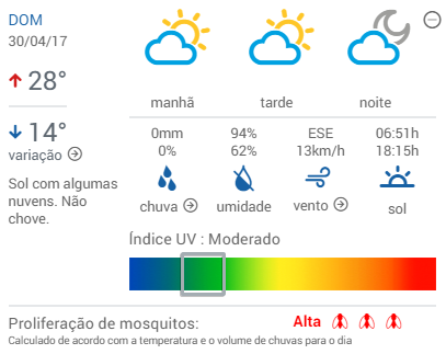 De acordo com o site Clima Tempo, a previsão para esta sexta feira (28) é de sol com algumas  nuvens, névoa pela manhã e poucas nuvens  a noite. A temperatura máxima deve ficar em 25ºC e a mínima em 12ºC, a probabilidade de chuva é de 0% com volume estimado em 0 mm.