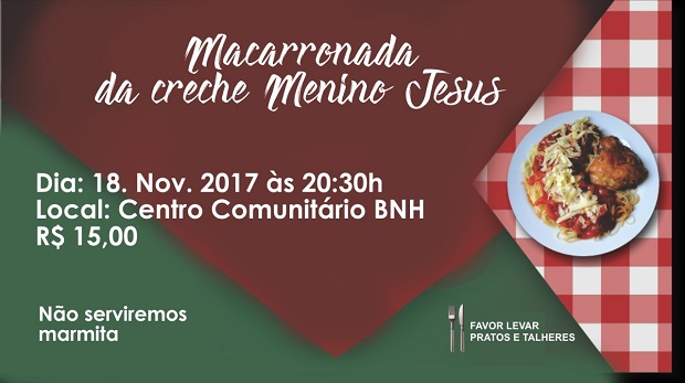 A Creche Menino Jesus realizará no dia 18 de novembro uma deliciosa Macarronada em prol da entidade.