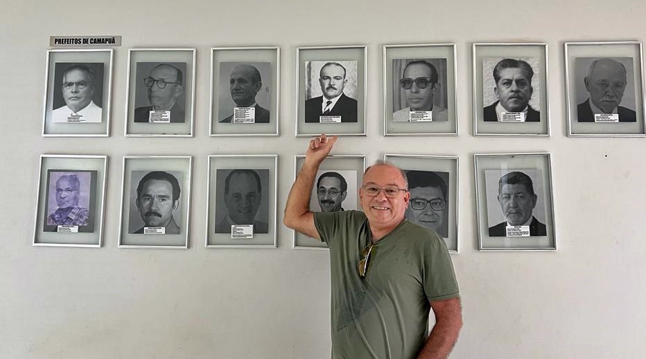 Admar ficou todo entusiasmado, pois há muitos anos não retornava a Camapuã e aproveitou para registrar o momento ao lado do retrato do pai, que está na galeria de ex-prefeitos no Paço Municipal.