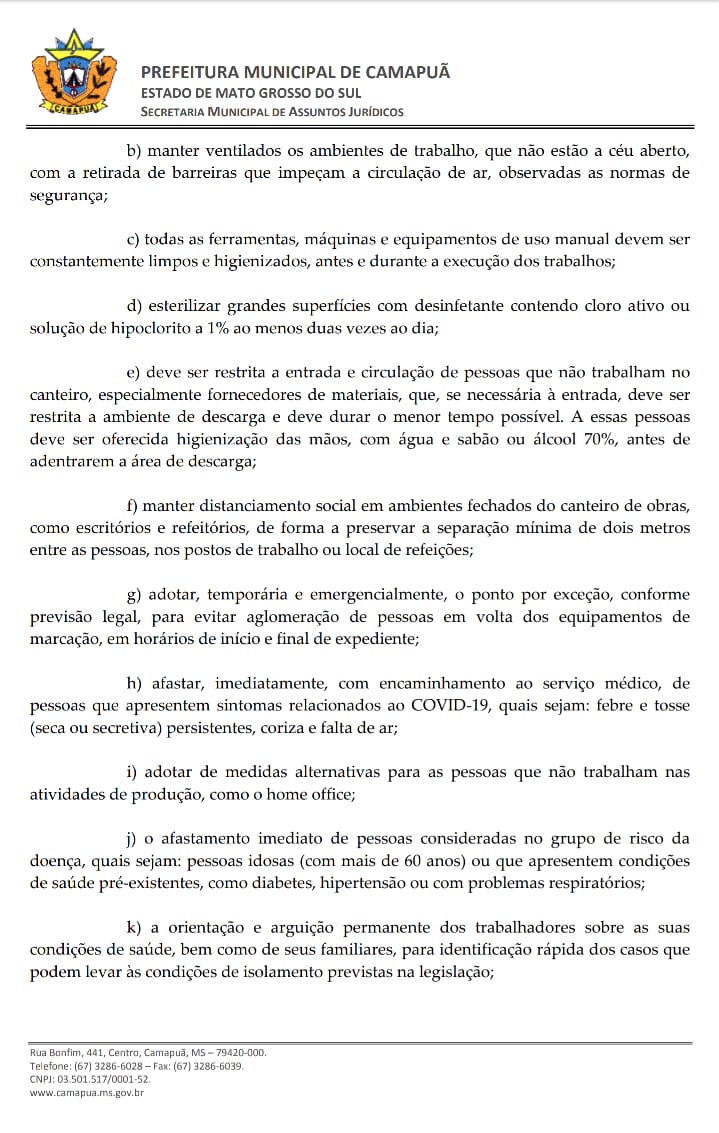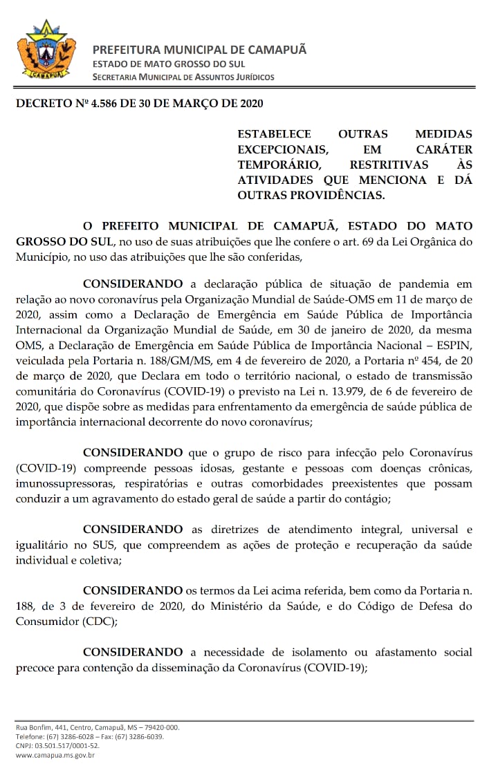 Na tarde desta segunda-feira (30), o Prefeito Municipal de Camapuã-MS, Delano de Oliveira Huber (PSDB), baixou novo decreto nº 4.586 com flexibilização para a operação de quatro atividades no município.