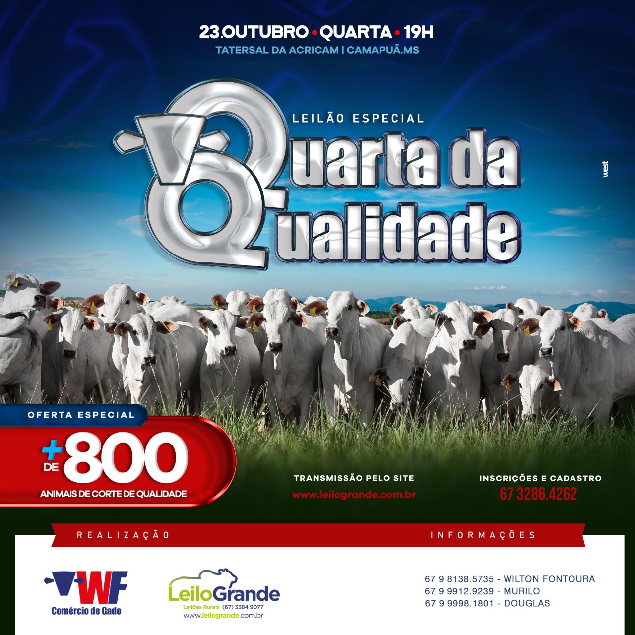 A WF Comércio de Gado, juntamente com a Leilogrande Leilões Rurais, realizará nesta quarta-feira (23), mais um leilão de gado de corte em Camapuã.
