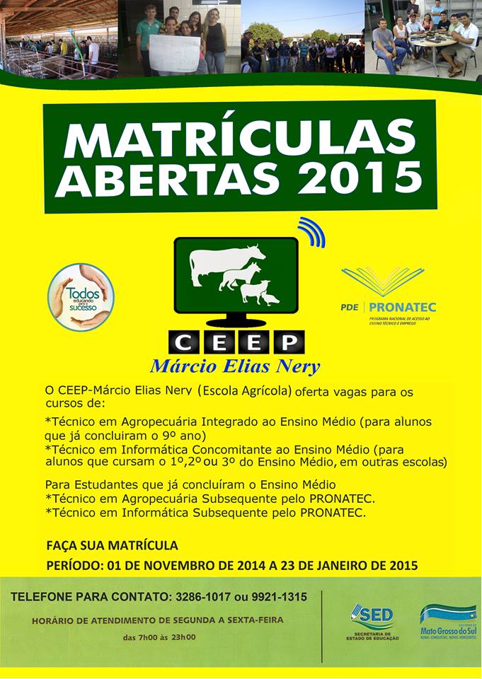 O Centro Estadual de Educação Profissional Márcio Elias Nery (Escola Agrícola) iniciou no dia 1º de novembro o período de matrículas para turmas de 2015, as inscrições seguem até o dia 23 de janeiro de 2015.