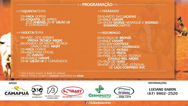 O encontro contará ainda com a realização do 6º Leilão LB e Convidados, prova técnica da ABQM (Associação Brasileira de Criadores de Cavalo Quarto de Milha), além das laçadas válidas pela Federação de Laço Comprido.