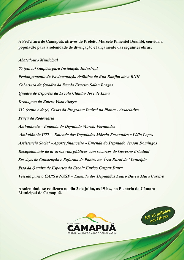 A Prefeitura Municipal de Camapuã através do prefeito Marcelo Duailibi, anunciou nesta semana o que realizará o lançamento oficial de um importante pacote de obras, que juntas atingem 16 milhões de reais em investimentos, entre verbas oriundas de repasses federais e estaduais, emendas de deputados estaduais e de receitas do próprio município.
