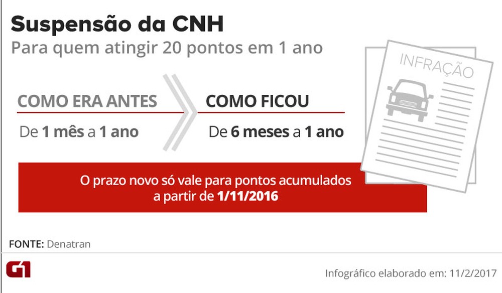 A lei passou a vigorar em 1º de novembro de 2016. Mas, para o motorista estar sujeito aos novos prazos, todos os pontos têm de ter sido atribuídos a partir dessa data, informa o Denatran.