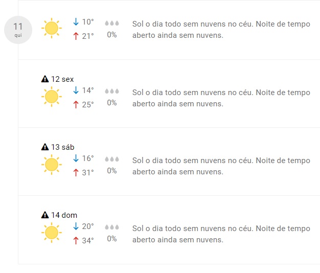 Outras máximas previstas para esta quarta-feira são de 17ºC em Nova Andradina e Naviraí, 19ºC em Chapadão do Sul e 21ºC em Aquidauana.