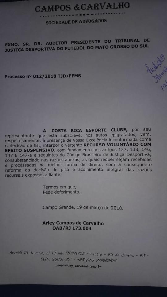 O Costa Rica espera voltar ao Estadual 2018 nos próximos dias. O time entrou com recurso voluntário com efeito suspensivo no Tribunal de Justiça Desportivo de Mato Grosso do Sul nesta segunda-feira (19). Na prática, a intenção é de retomar a vaga após eliminação em primeiro julgamento na escalação irregular do lateral Paulinho.