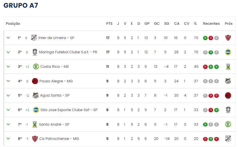 Veja abaixo a classificação atualizada do Grupo A7 da Série D: