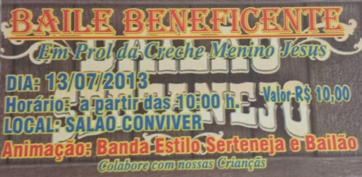 A Creche Menino Jesus realizará neste sábado (13) um sensacional bailão sertanejo no salão do Conviver.