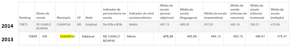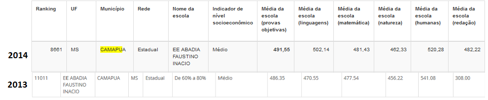 Na média geral o desempenho foi bem semelhante em comparação a 2013, registrando uma queda de 00,19 (2013 média 475.40 e 2014 média 475.21).
