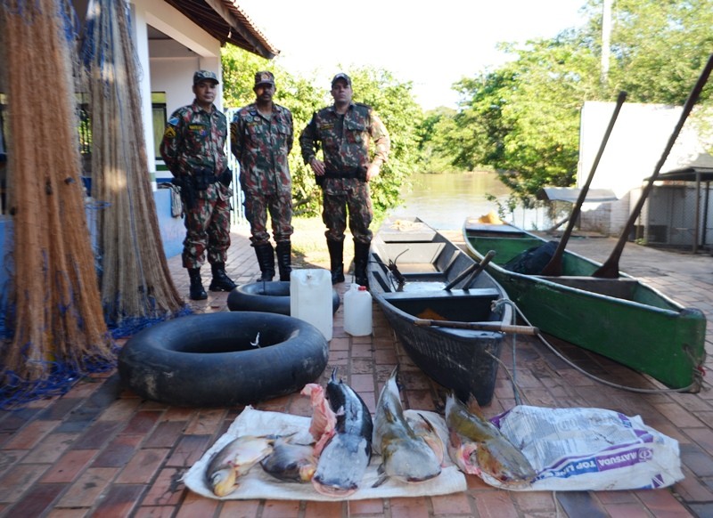 Próximo das boias, os policiais encontraram um saco amarrado em dois galões, que armazenava dois pacus, três piaus e piranhas. Os apetrechos e o pescado foram apreendidos.