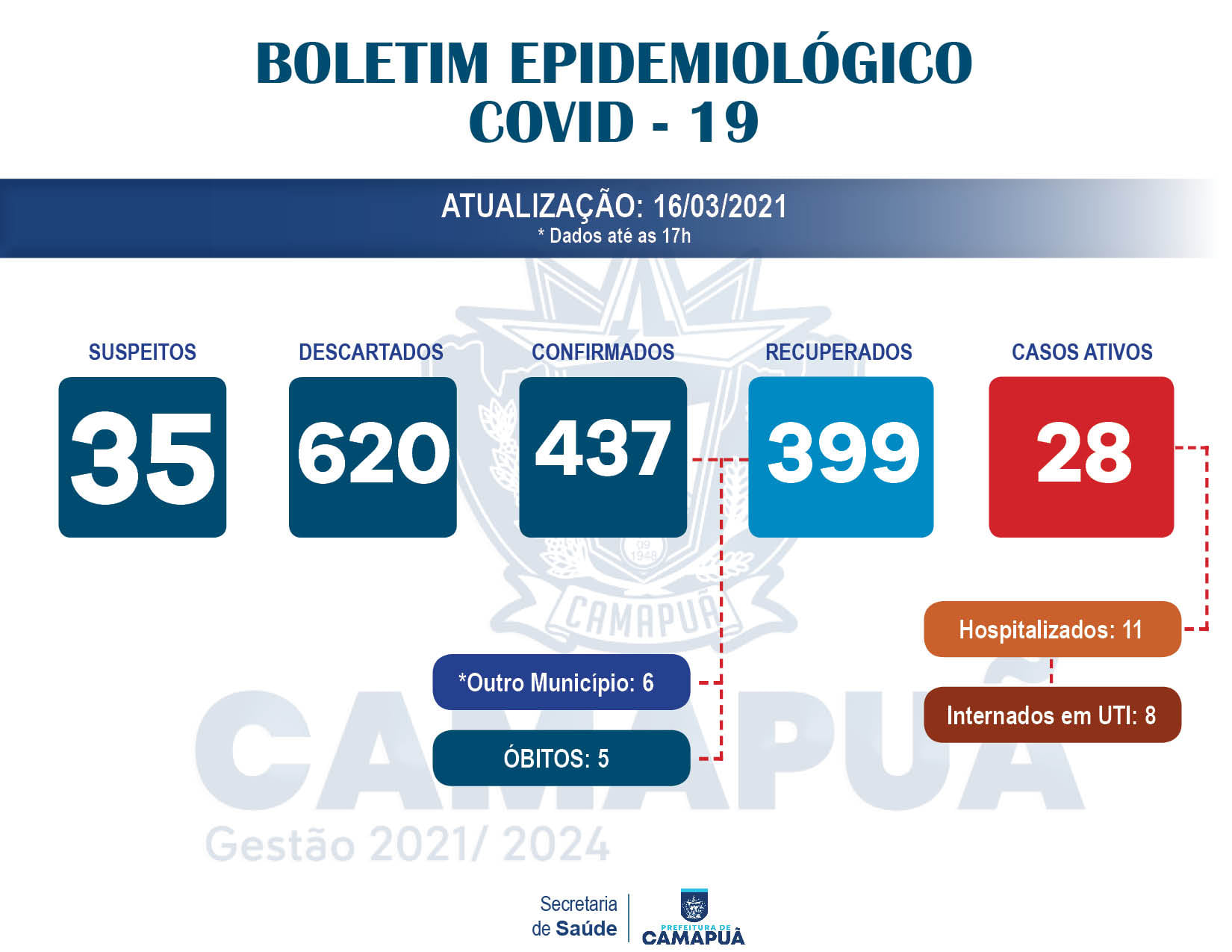 Confira abaixo o último boletim epidemiológico da Covid-19 divulgado pela Prefeitura de Camapuã no final desta tarde (16).