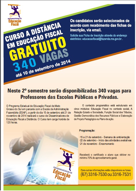 O Programa Estadual de Educação Fiscal de Mato Grosso do Sul em parceria com a ESAF (Escola de Administração Fazendária), a partir do dia 15 de setembro até 21 de novembro de 2014 realizará o curso de Disseminadores de Educação Fiscal a Distância. O Curso tem carga horária de 120 horas.