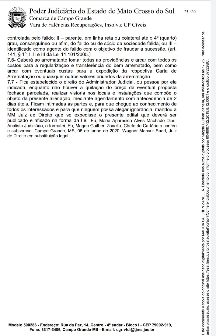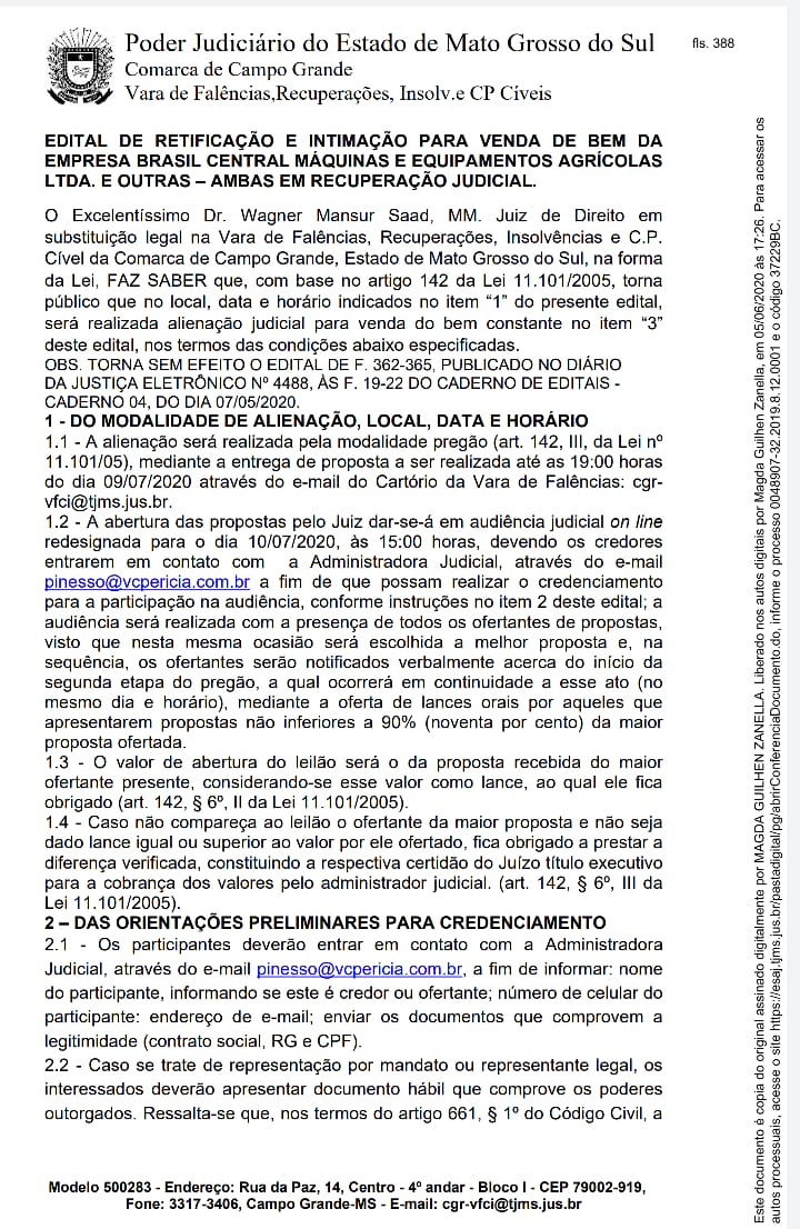 Torna-se público, Edital de retificação e intimação para venda de bem da empresa Brasil Central Máquinas e Equipamentos Agrícolas Ltda. E Outras. Ambas em recuperação judicial.
