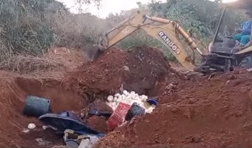 A PM atuou no apoio à Vigilância Sanitária. O produto estava estocado em cisternas com tampas improvisadas e em processo de deterioração. Foram recolhidos pelos agentes que acompanharam o trabalho de descarte num buraco e enterrados com uma retroescavadeira.