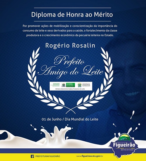 O prefeito Rogério Rosalin, de Figueirão, recebeu do Governo do Estado de Mato Grosso do Sul o diploma de honra ao mérito como “Prefeito Amigo do Leite”. A homenagem é referente às ações de incentivo à produção e ao consumo no município, mesmo ainda não havendo um laticínio naquela localidade.