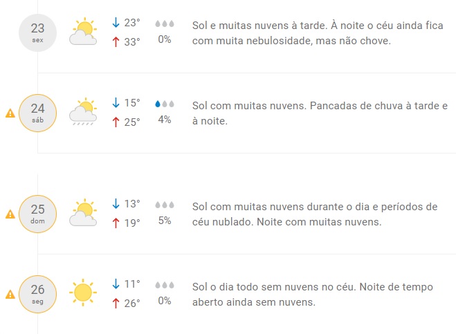 Confira abaixo a previsão do tempo para Camapuã neste fim de semana, conforme o site Clima Tempo.