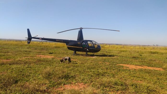 A apreensão ocorreu no momento que a aeronave, helicóptero modelo Robinson-R44, realizou pouso no local para o reabastecimento.