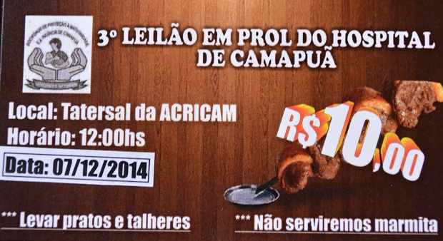 O Hospital de Camapuã (Sociedade de Proteção a Maternidade e a Infância de Camapuã) realizará no dia 7 de dezembro (domingo) um suculento churrasco e leilão solidário visando arrecadar fundos para contribuir com o pagamento de despesas e promover melhorias na entidade.