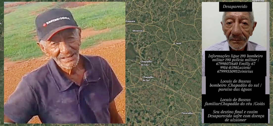 As buscas por Juraci Pimenta de Oliveira, de 75 anos, morador de Coxim, considerado desaparecido na região de Paraíso das Águas/Chapadão do Sul, serão estendidas para o município de Chapadão do Céu, no estado de Goiás. O idoso fugiu de uma comunidade terapêutica onde estava internado e, desde então, não foi localizado.
