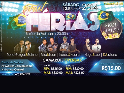 O evento que iniciará as 23 horas, contará com a animarão a Fest Férias as Duplas Ronair Borges & Edinho, Miro & Luan, Kassio & Hudson, Hugo & Leo e DJ Juliano, além de oferecer cerveja Skol por R$: 1,99 a noite toda.
