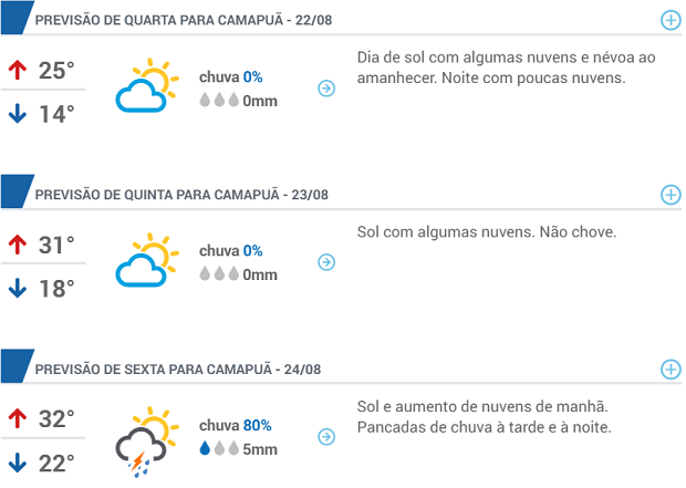 Em Camapuã a previsão do tempo é de Tarde de sol com diminuição de nuvens. Noite com muita nebulosidade. Confira a previsão para o restante da semana.