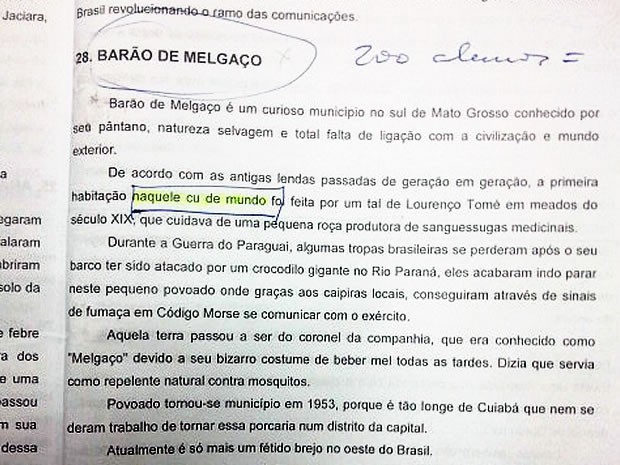 "Povoado tornou-se município em 1953, porque é tão longe de Cuiabá que nem se deram ao trabalho de tornar essa porcaria num distrito da capital. Atualmente é só mais um fétido brejo no oeste do Brasil", diz outro trecho da apostila, com a qual os alunos vinham estudando há cerca de 15 dias. O curso visa capacitar profissionais para atuar no setor hoteleiro de Cuiabá e das cidades situadas no entorno da capital durante a Copa de 2014.