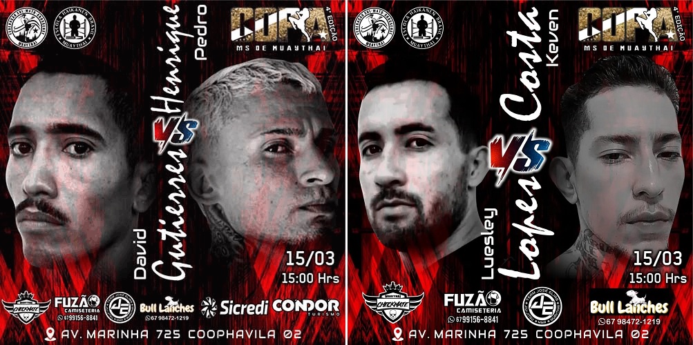 Dois atletas da equipe Team José Elias, de Camapuã, cidade a 140km de Campo Grande, estão confirmados para a 4ª Edição da Copa MS de Muaythai. São os lutadores David Gutierres, que foi campeão brasileiro recentemente e terá uma disputa de cinturão contra Pedro Henrique e, Luesley Lopes que enfrentará Keven Costa