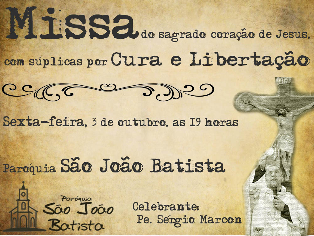 A Missa do Sagrado Coração de Jesus, com orações por Cura e Libertação será ás 19 horas, na Igreja Matriz.