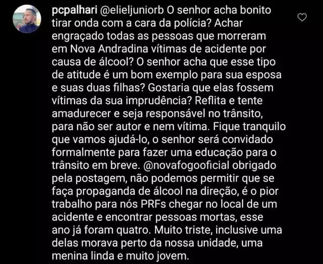 “O senhor acha bonito tirar onda com a cara da polícia? Acha engraçado todas as pessoas que morreram em Nova Andradina vítimas de acidente por causa de álcool? O senhor acha que esse tipo de atitude é um bom exemplo para sua esposa e suas duas filhas? Gostaria que elas fossem vítimas da sua imprudência? Reflita, tente amadurecer e seja responsável no trânsito, para não ser autor e nem vítima”, escreveu o PRF.
