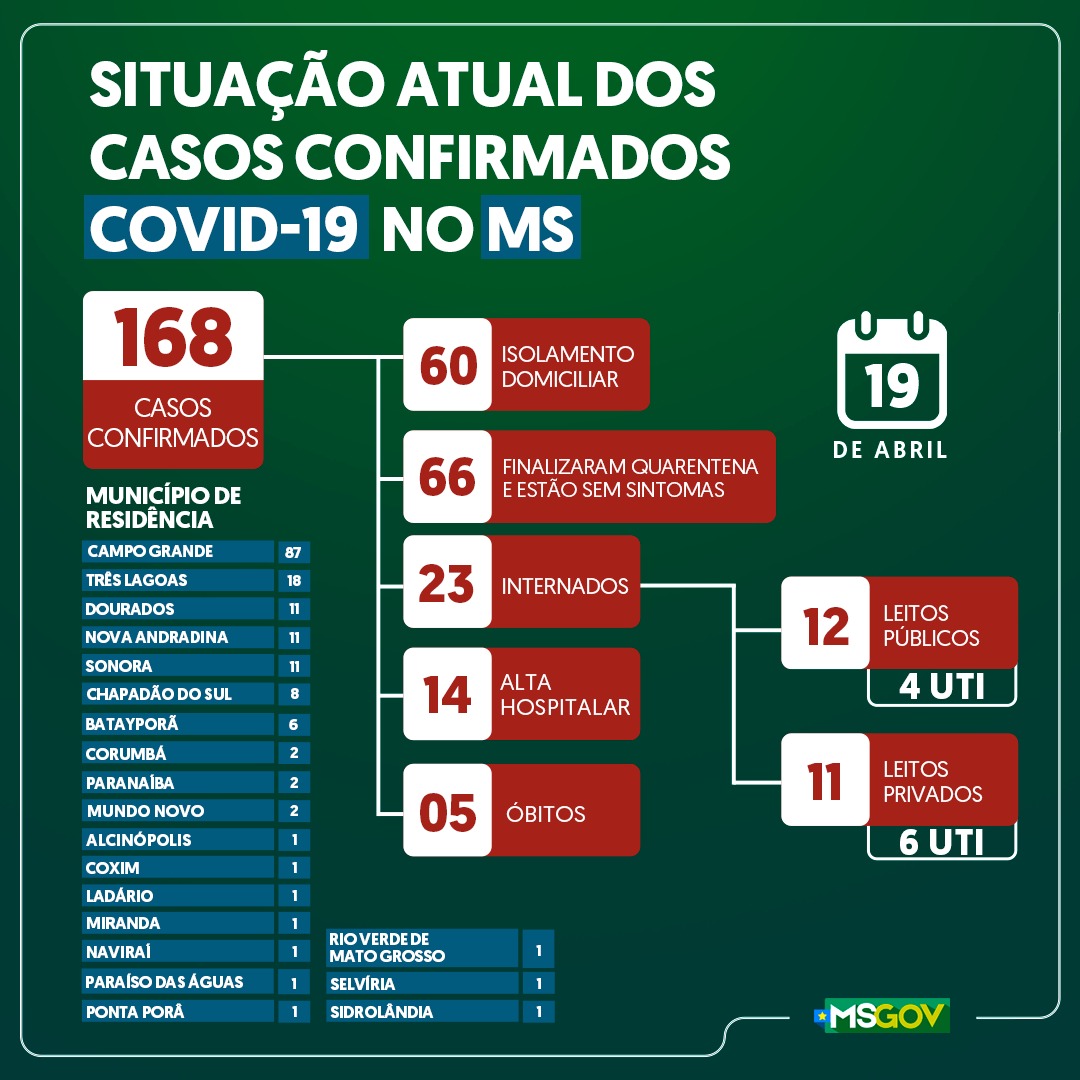 MS segue ainda com outros 60 casos sendo acompanhados em isolamento domiciliar. O Estado já teve cinco óbitos.