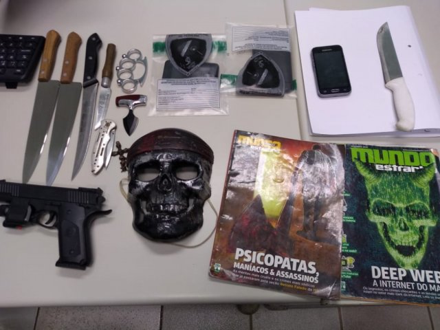 Na casa do amigo, foram encontradas arma de brinquedo, quatro facas, um punhal, canivete, crucifixo com caveiras, soco inglês e revistas cujo tema era psicopatia.