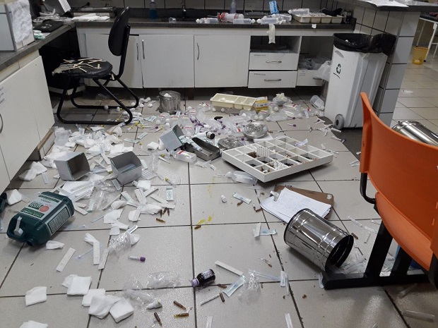 Conforme o registro policial foram quebrados 5 termômetros de mercúrio, danificados 500 unidades de gases, 500 unidades pacotes abaixadores de língua, 100 seringas de 5,10,20 ml, quebrados 2 frascos de insulina NPH, 2 frascos de insulina regular, danificadas 3 caixas de luvas de procedimentos (60 unidades), quebrados 2 frascos de berotec, 2 frascos de atrovent, 50 ampolas de diclofenaco, 50 prometazina, 50 dipirona, 50 niacina, 50 complexo B, 50 ranitidina, 50 furosemida, 2a ampollas de aminofilina, 20 lidocaína, 20 cetoprofeno e 20 gentamicina.