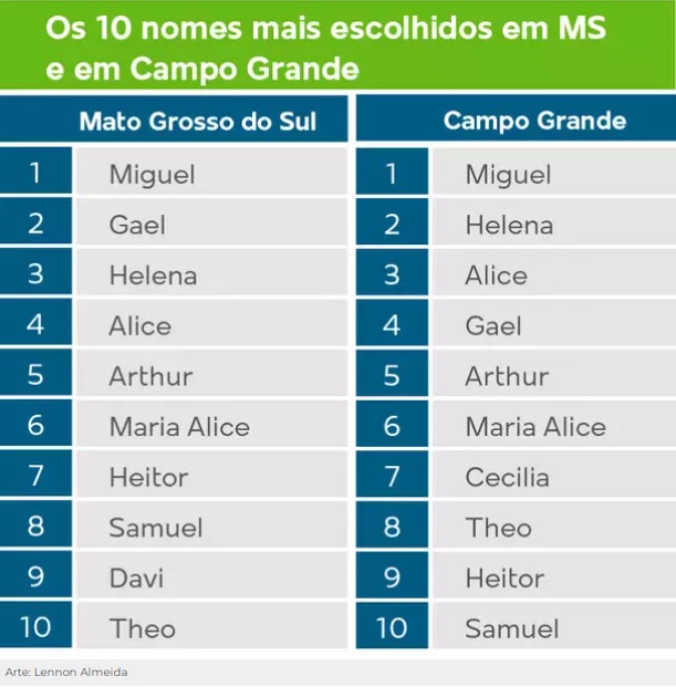 Seguindo a tendência nacional e pelo terceiro ano consecutivo, Miguel foi o nome mais registrado nos cartórios de Mato Grosso do Sul. Foram 462 certidões de nascimento emitidas com o nome. Para as meninas, Helena liderou o ranking com 411 registros no Estado. A dupla de nomes também foi a mais escolhida para bebês do sexo masculino e feminino em Campo Grande.