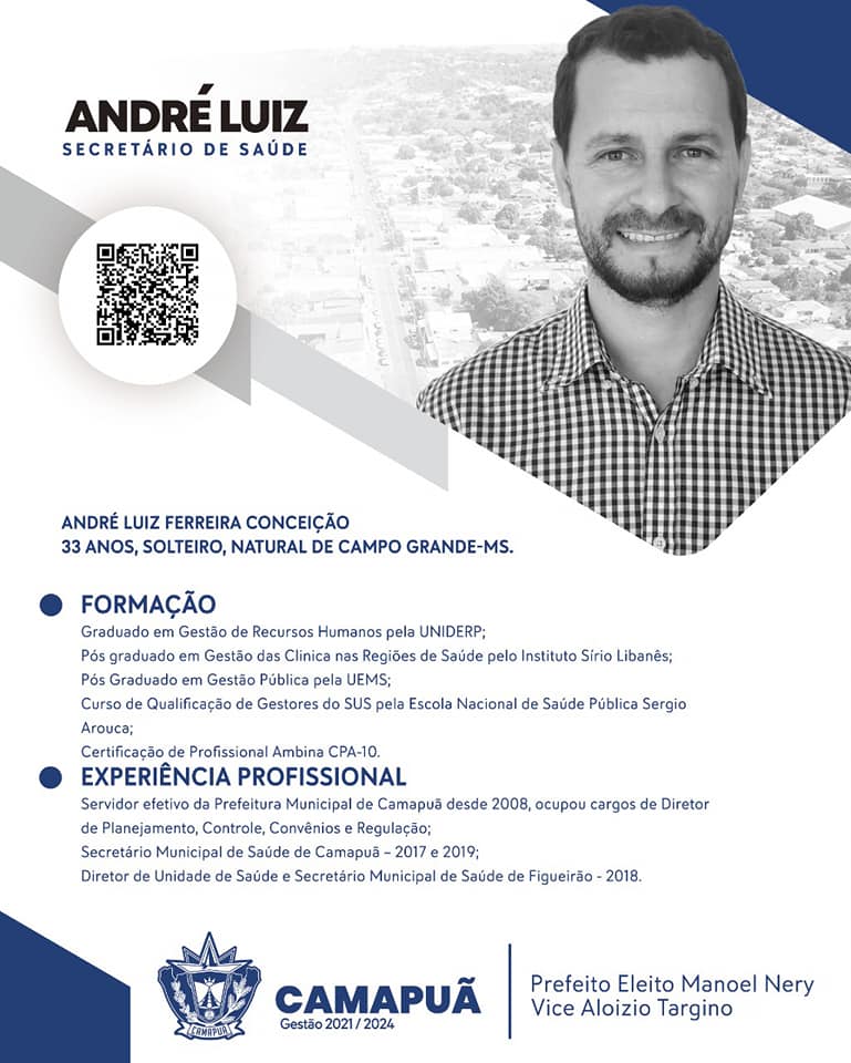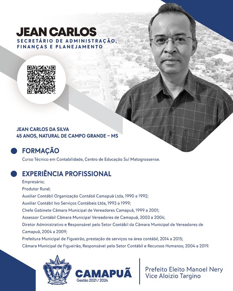 Na tarde desta terça-feira (15), o Prefeito eleito em Camapuã Manoel Nery (DEM), juntamento com seu vice Aloizio Targino (Patriota), divulgaram através de rede social, os nomes de seus secretários, que os acompanharão no próximo mandato executivo de 2021 a 2024.