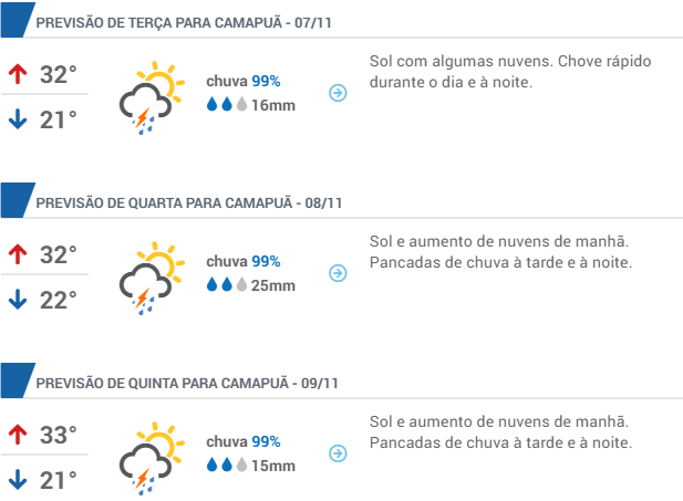 Segundo o site Clima Tempo, a probabilidade de chuva em Camapuã nesta segunda é de 60%, com volume de 18mm, com sol e aumento de nuvens de manhã, com chuva a qualquer hora, confira abaixo a previsão para o restante da semana.
