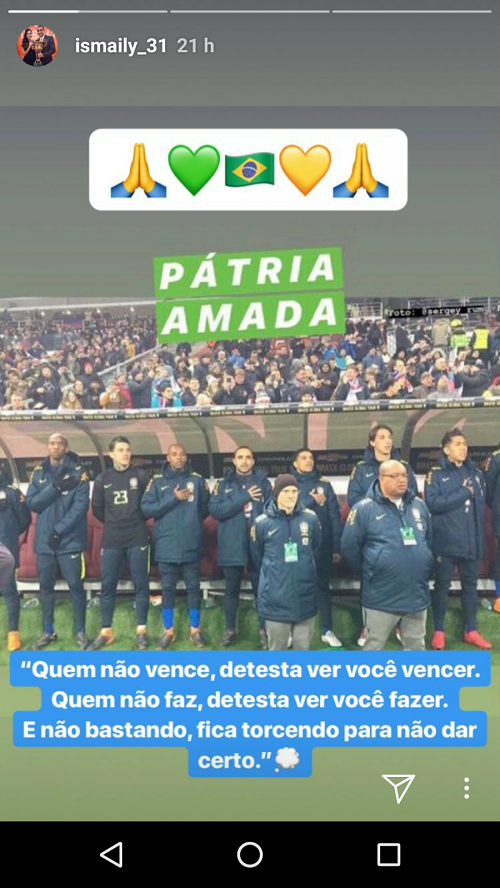 "Semana incrível, experiência única e de muito aprendizado. Estar na maior seleção da história, representando as cores do meu País tem um sentimento especial. Obrigado Deus por me proporcionar esse momento tão especial", escreveu Ismily em seu perfil no Instagram, já de volta a Donetsk, onde defende o Shakhtar.