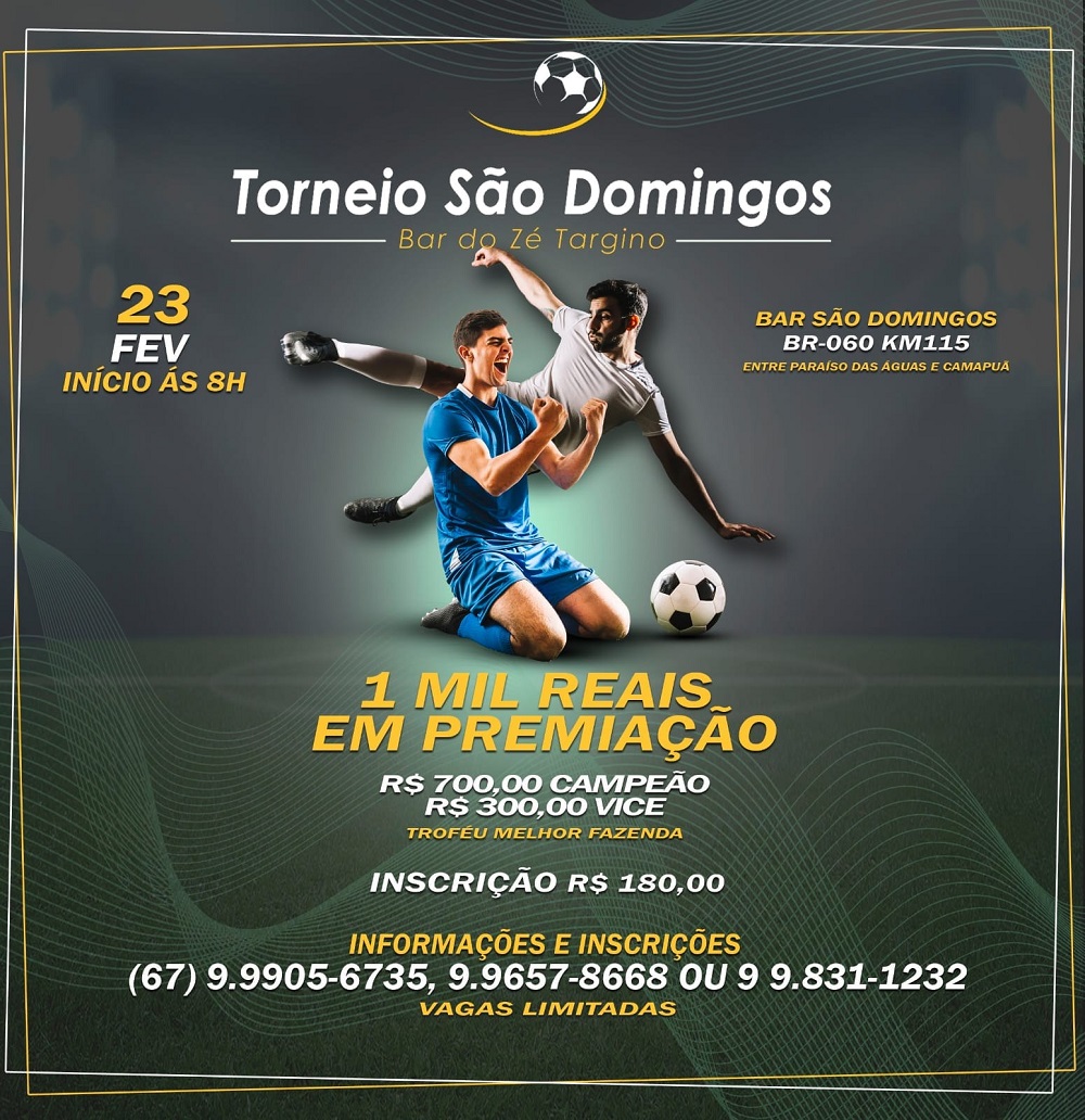 No próximo dia 23 de fevereiro, acontece mais uma edição do Torneio São Domingos, tradicional competição de futebol society, realizada no campo do Bar e Conveniências do Zé Targino, localizado as margens da BR-060, na altura do KM 115, no município de Paraíso das Águas-MS.