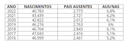 Em 2017, o número de crianças com pai ausente teve uma leve queda, com 5 pontos percentuais - o menor registrado -; foram 47.043 nascidos e 2.416 ausências paternas.