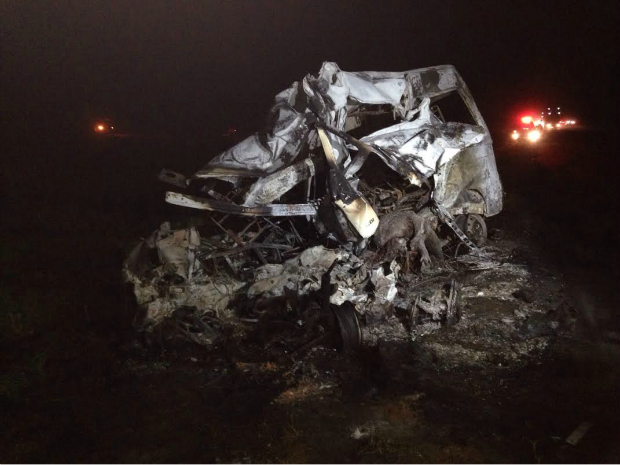 Van atropela anta, bate em carreta, pega fogo e 7 pessoas morrem