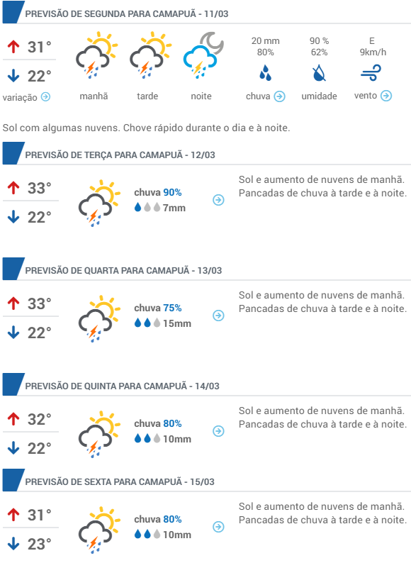 A previsão do tempo para esta semana é de calor e chuva para Camapuã. As temperaturas máximas de cada dia ficam entre 31°C a 33° C, já as mínimas ficam entre 22°C e 23°C.