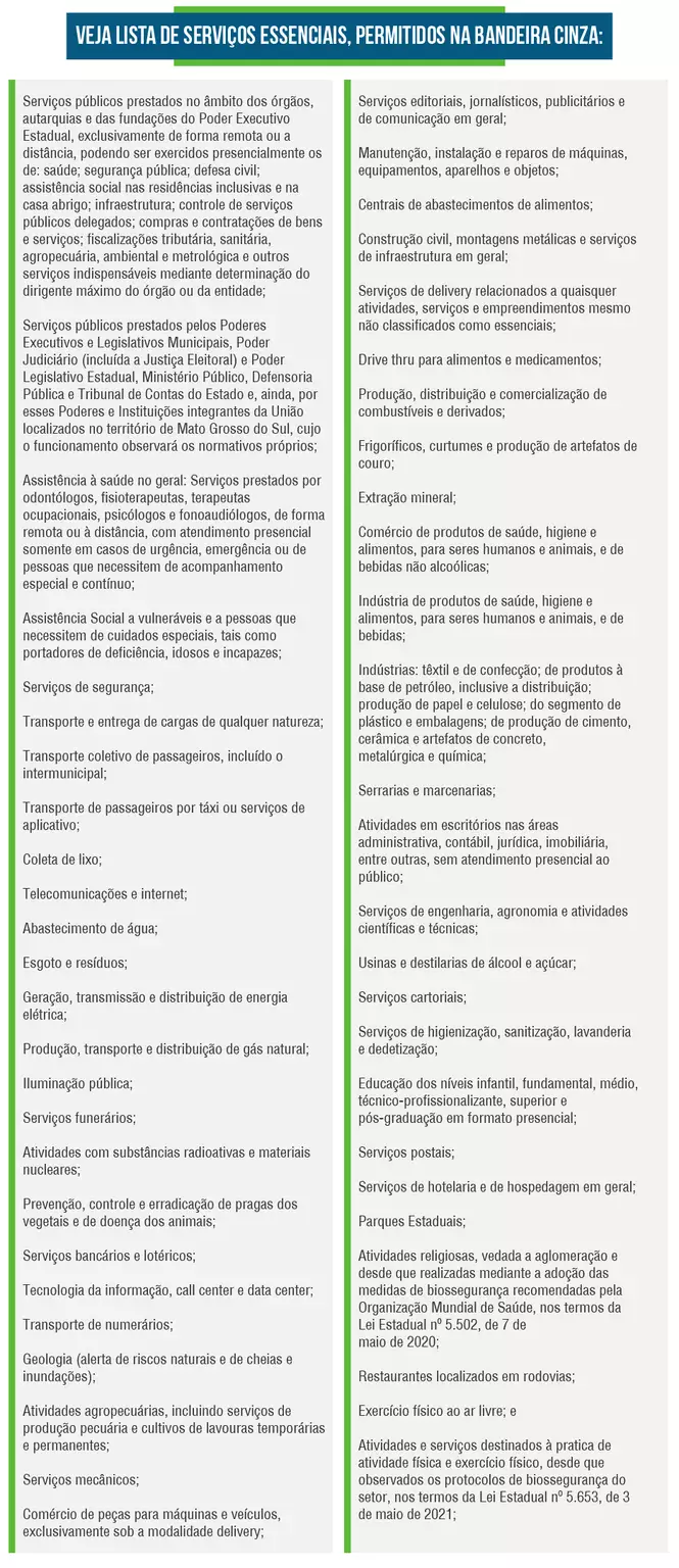 A bandeira cinza do Prosseguir (Programa de Saúde e Segurança na Economia), que nesta última edição tinge 43 dos 79 municípios de Mato Grosso do Sul, incluindo Camapuã, permite o funcionamento de 51 atividades no período de 11 a 24 de junho. Já os shoppings, salões de beleza, lojas de roupas, buffets, bares e restaurantes têm de fechar.