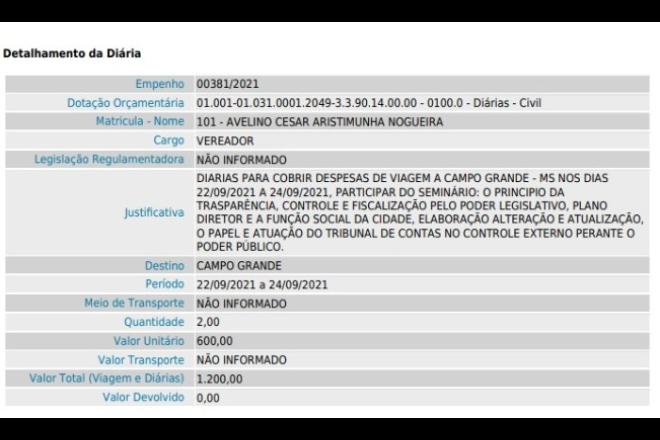 Conforme descrito no relatório da Câmara Municipal de Jardim, as diárias seriam para cobrir as despesas e viagem para Campo Grande, para participar do seminário.