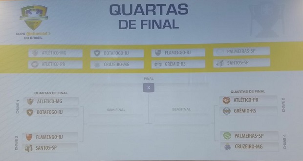 Foram definidos na manhã desta segunda-feira os confrontos das quartas de final da Copa do Brasil, em sorteio realizado na sede da CBF, na zona oeste do Rio de Janeiro. Apesar de rivais do Rio Janeiro, São Paulo e Minas Gerais presentes, não haverá clássicos estaduais nesta fase da competição. O Grêmio, atual campeão, encara o Atlético-PR.