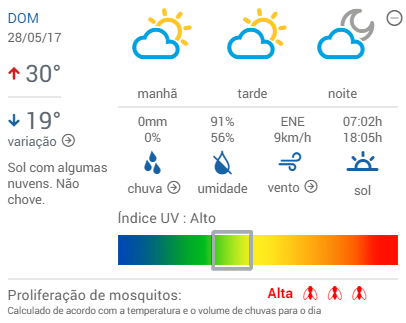 De acordo com o site Clima Tempo, a previsão para esta sexta feira (26) é de sol com algumas nuvens, não chove. A temperatura máxima deve ficar em 33ºC e a mínima em 23ºC, a probabilidade de chuva é de 0% com volume estimado em 0 mm.