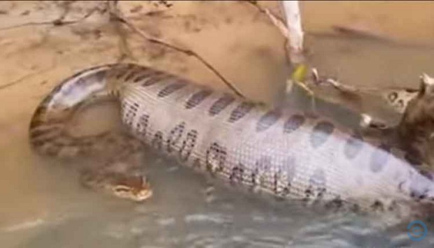 Amigos pescadores se surpreenderam com o tamanho de uma sucuri encontrada durante pescaria no rio Aquidauana, nesta sexta-feira (14).